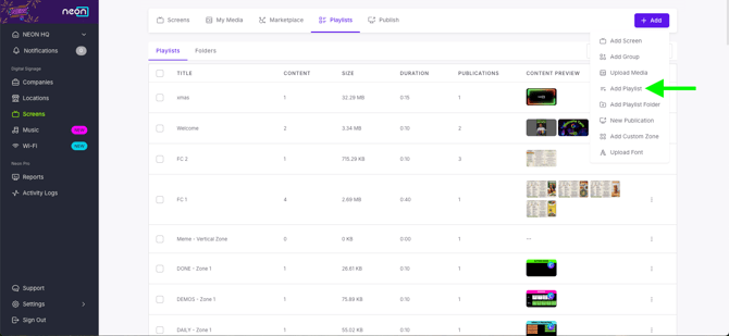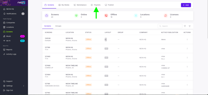 - In the Screens section, select the Playlists tab