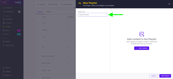 Click the purple +Add button in the top right corner of your screen and select Add Playlist from the dropdown menu