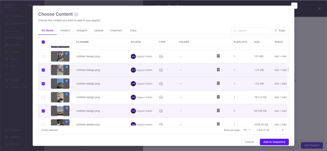 5. In the Choose Content window, select the media you would like to add to the playlist, then click Add to Sequence when you are done making selections