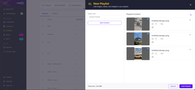 6. Your media has been added to the playlist! The order you see the media listed in is the order in which it will be displayed on the screen. You can click and drag each item to rearrange the order. If available, you can also adjust the duration that a single piece of content will be displayed during the playlist sequence or schedule individual media components to display only within certain timeframes